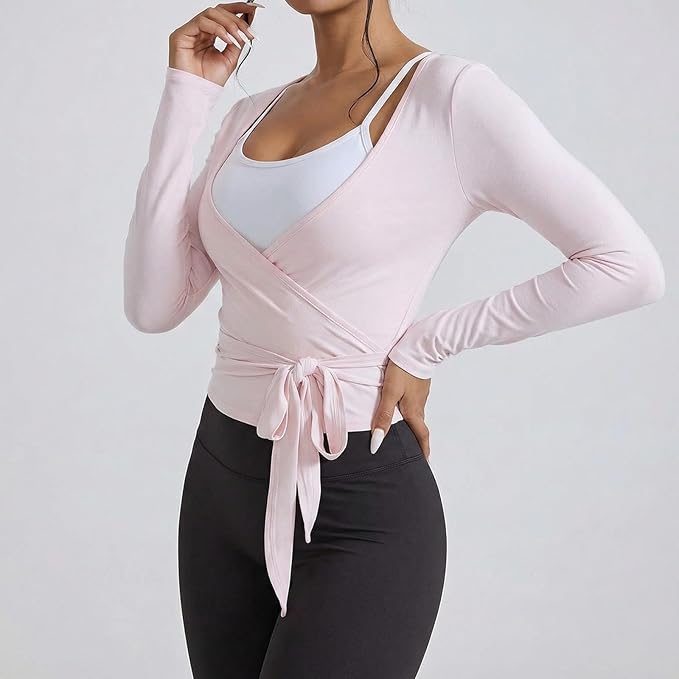 Wrap tops are especially popular for studio workouts because they keep you warm while still looking flattering and feminine.