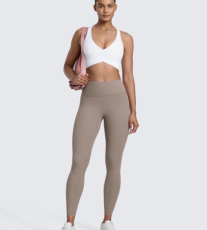 One of my favorite affordable activewear brands right now is CRZ Yoga on Amazon. The quality is buttery soft, the pieces stay in place during workouts, and there are options with a subtle invisible scrunch for that extra lifted look. They also offer styles without a front seam, which helps avoid the camel toe issue we all know and hate. Another great part is the wide variety of colors available for each piece, making it easy to build a neutral set that fits your personal style!
